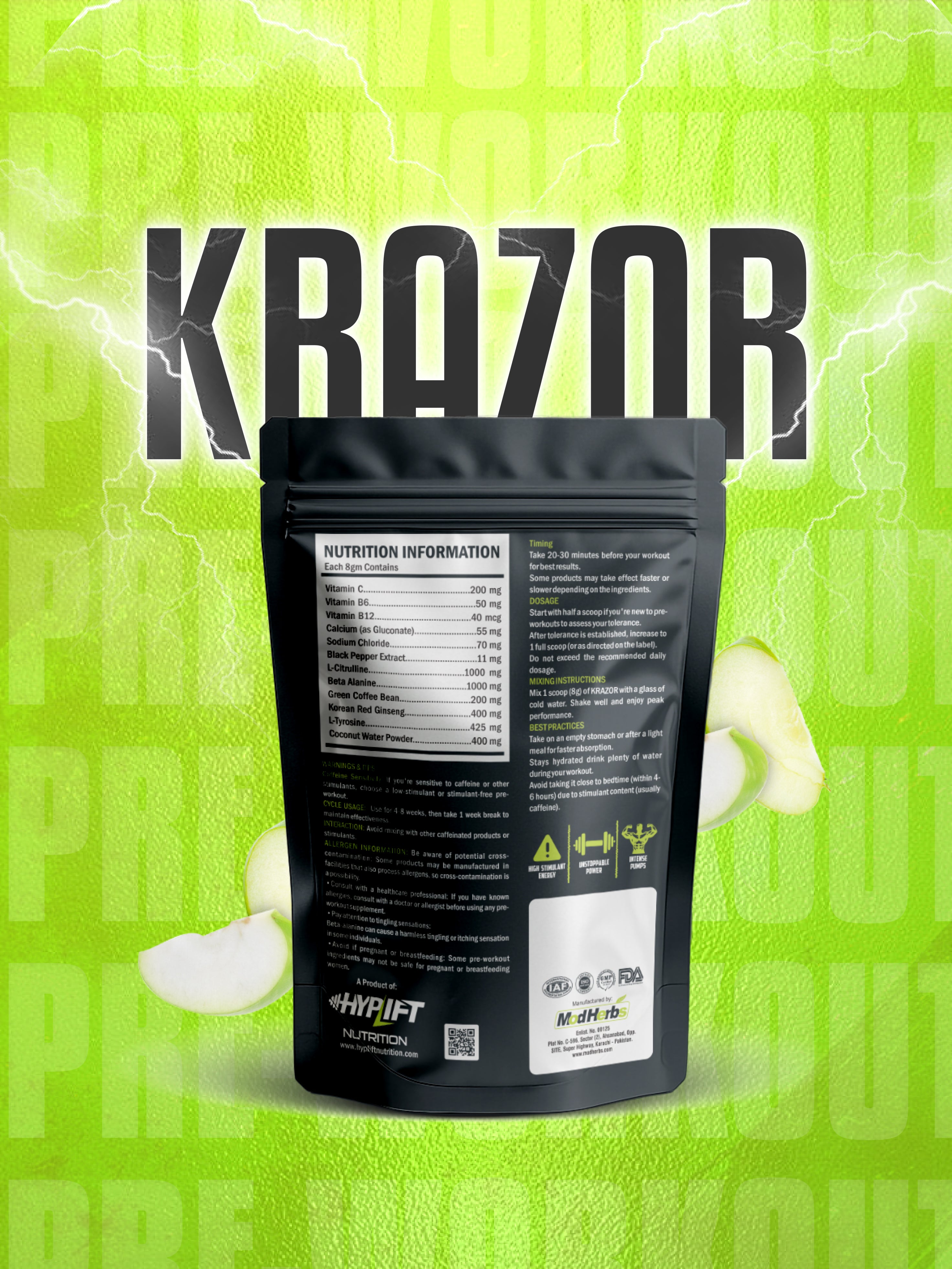 KRAZAOR was designed to be practical, safe, and body-friendly. Its natural stimulant profile ensures your body gets the energy it needs without the side effects associated with harsh synthetic blends. Once it kicks in, users experience improved blood flow, steady energy, and heightened focus a balanced performance boost that feels like your body’s own engine turning on, not a forced adrenaline rush. Whether you're cutting, bulking, or training late at night, KRAZAOR supports your workout without disturbing your sleep or causing discomfort.